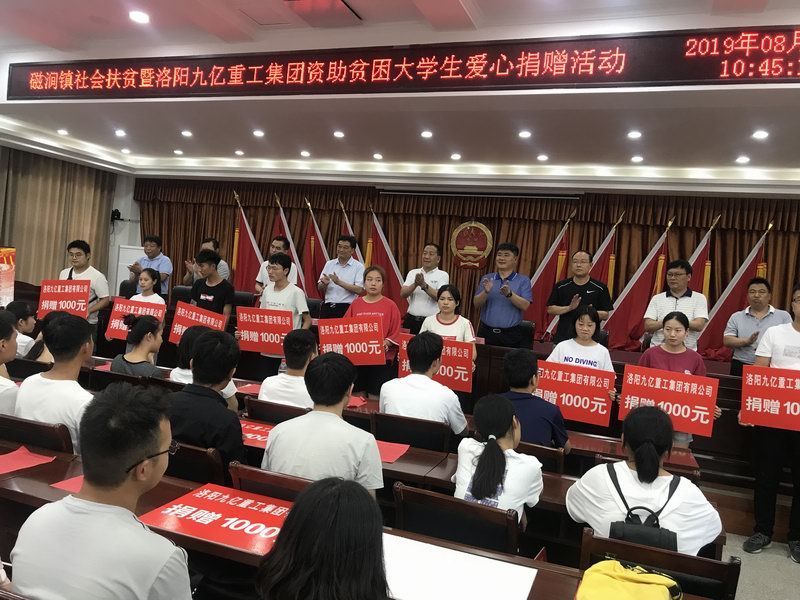愛是與生俱來的,在血液里流動,在骨子里結晶,它源源不斷的由心而生,永不枯竭,只要人人都愿意奉獻一點愛,就如甘霖沐浴大地,人間處處盛開幸福之花!   為響應洛陽市政府精準扶貧政策,洛陽九億重工集團有限公司及董事長王九茂積極參與捐資助學的慈善義舉活動,特做出如下決定:1、公司幫扶磁澗鎮2017年新招貧困大學生21名順利入學,每人資助2000元,總計肆萬貳仟元整;   2、總經理王九茂(縣政協委員)以個人名義資助磁澗鎮南窯村2017年新招大學生6名,總計12000元整;   我相信,在社會各界的大力支持和共同努力下,我們的“愛心助學”活動將會惠及到更多的同學,為了夢想,刻苦讀書、報銷祖國,廣大同學也一定會在溫暖的社會大家庭里茁壯成長,必將成為國家建設的有用之才!   洛陽九億重工集團有限公司   董事長:王九茂
